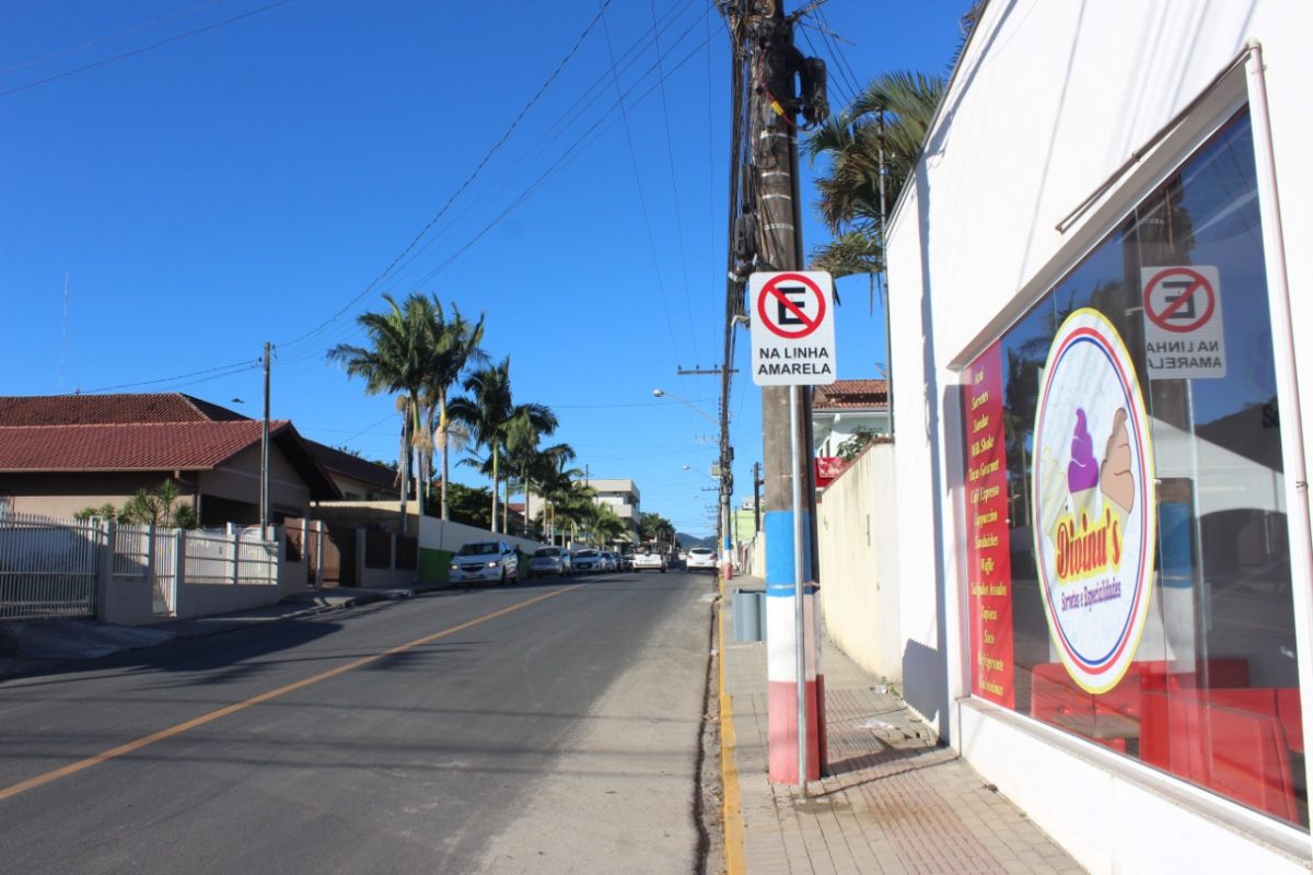 Recentemente asfaltada, a rua Jorge Lacerda, no Centro de São João Batista, está ganhando agora nova sinalização viária. Após a pintura do eixo e das faixas elevadas, foi efetuada nesta semana a implementação de novos pontos de proibição de estacionamento, com pintura de faixas amarelas e colocação de placas.